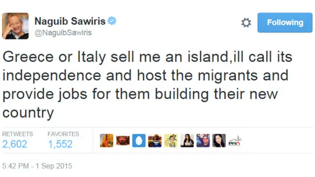 مصري میلیاردر او سیکولر سیاستوال نجیب ساویرس له ایټالیا او یونان غوښتي چې په مدیترانې کې یو پرېښودل شوی ټاپو پر ده وپلوري، چې هلته د منځني ختيځ او د افریقا د شمالي برخو پناه غوښتونکو ته یو ''نوی خپلواک هېواد'' پکې جوړ کړي.
