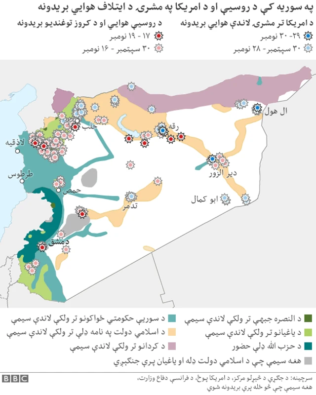 روسیې په تېر سپتمبر کې سوریه کې بریدونه پیل کړل، خو د امریکا په مشرۍ ایتلاف بیا نژدې یو کال وړاندې هوايي بریدونه پیل کړي دي.