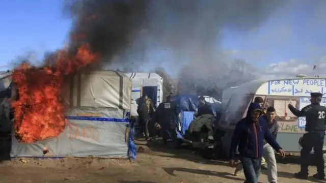کالای کې د بي بي سي خبریال انا هولېګن وایي، وایي چې د پاکوونکو ډلو او کډوالو ترمنځ شخړې د دوشنبې تر ماښامه روانې وې او یوه ډله ګډوال لویې لارې ته راووتل چې د کالای بندر ته غځېدلې ده.