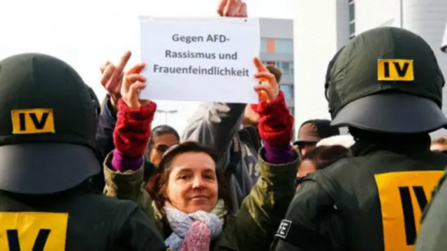 پولیس د مرچو سپرې په کارولو سره د هغو معترضانو مقابلې ته لاړل چې په اوسپنیزو میلو او لرګیو یې غوښتل د کنفرانس ودانۍ ته "د جرمني لپاره بدیل" ګوند غړو د ورتګ مخنیوی وکړي.