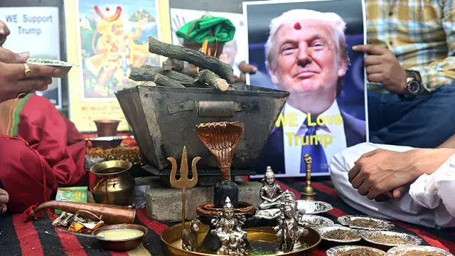 د یوې ښۍ اړخې هندي ډلې لسګونو غړو د دیني مراسمو په ترڅ کې د چارشنبې په ورځ اور بل کړ چې ورسره يې سندرې زمزمه کولې. له خپلو خدایانو يې غوښتنه کوله چې ټرمپ د امریکا د متحد ایالاتو ولسمشرۍ لپاره بریالی شي.