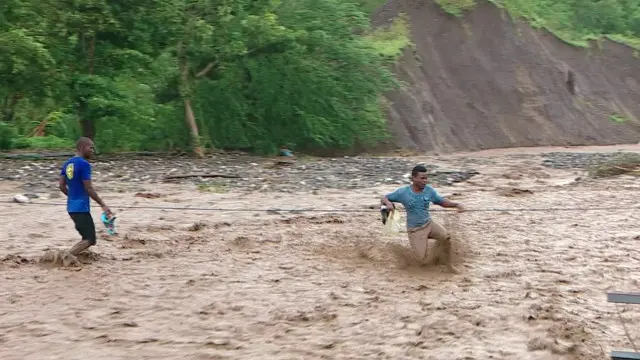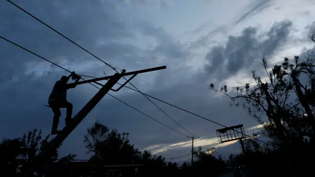 له توپان وروسته په هایټي کې د برېښنا یو کارکوونکی مزي تړي.