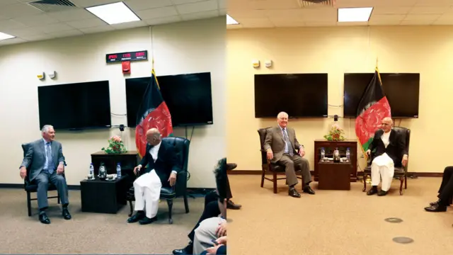 آقای عبدالله و سایر مقامهای ارشد حکومت افغانستان در طرف راست عکس در کنار آقای غنی و هوگو لورنز، سفیر آمریکا و ژنرال جان نیکلسون فرمانده آمریکایی نیروهای بینالمللی در طرف چپ و کنار آقای تیلرسون نشستهاند. هیچ نشانهای از دفتر آقای غنی در این اتاق دیده نمیشود.