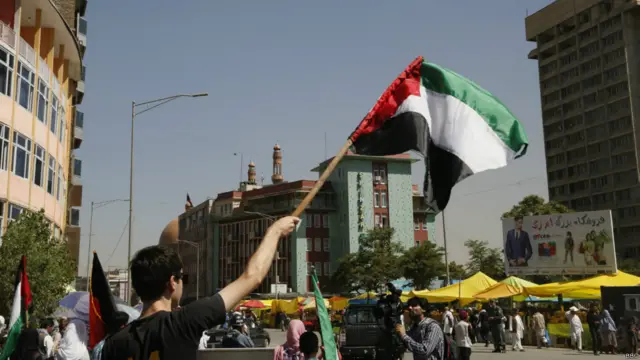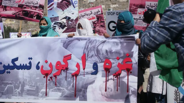 دها شهروند کابل، وابسته به یک حزب سیاسی به منظور ابراز همدردی با مردم عزه در این شهر تجمع اعتراضی بر پا کردند.