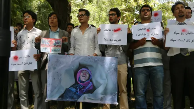 توضیح تصویر، هرچند نشانی این معترضان گروه طالبان که از سیزده سال به این سو با دولت افغانستان میجنگند بود اما طالبان گفته اند که در کشتار غور افراد شان نقشی نداشته اند.