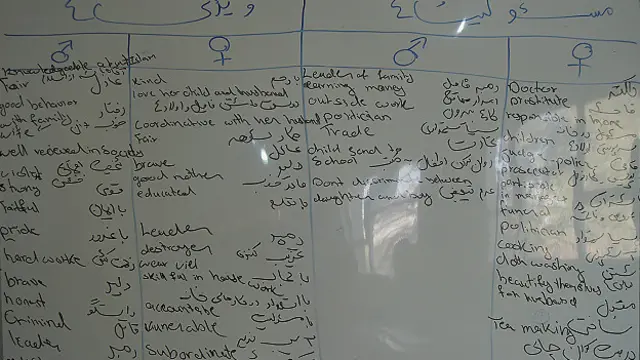 رحیم، صبور، آسیبپذیر، محکوم، مقبول، زودباور و خودسر از جمله ویژگیهایشان است و خانهدار، شوهردار، آشپز، مادر خوب، احترام به بزرگ فامیل و در مواردی دکتر، سیاستمدار یا فاحشه، در ردیف مسئولیتهایشان آمده است؛ اینها را افسران پلیس افغان روی تخته کلاس در مورد ویژگی و مسئولیتهای زنان نوشتند.
