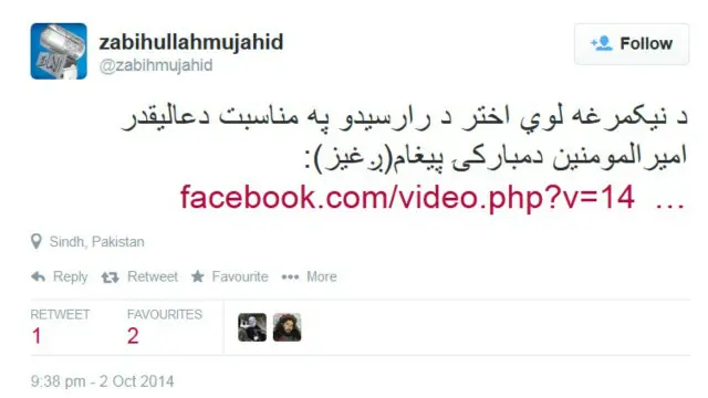 ذبیحالله مجاهد، که خود را سخنگوی طالبان معرفی میکند، در توییتر، حضور خود در ایالت سند پاکستان را رد کرده و گفته است که در <link type="page"><caption> توییتهای</caption><url href="http://www.bbc.co.uk/persian/afghanistan/2014/10/141002_mgh_mar_zabi_twitter_location_revealed" platform="highweb"/></link> تبریک عید، "سازمان استخباراتی دشمن داخل صفحه من شد و موقعیت فرستادن توییتها را سند پاکستان نوشت."