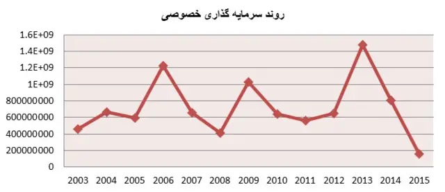 شکل بالا، نشاندهنده روند نوسانی در میزان سرمایهگذاریهای خصوصی است. آنگونه که به روشنی قابل مشاهده است، در جریان یک سال گذشته میزان سرمایهگذاریهای خصوصی به پایینترین سطح در مقایسه با ۱۳ سال گذشته رسیده است.