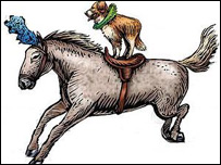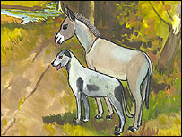 شير به هزار زحمت خرس را تا نهر می برد و چون دوباره توان بازگشتش را ندارد در نهر پرتابش می کند و خود با قهر وغضب برگشته اين مسابقه را بی معنا می خواند. همه حيوانات از باختن شيرمی ترسند و دور می روند اما خر (درازگوش) به پای کوبی می پردازد هرچند بنجر مانع شادمانی اش می شود ولی سودی ندارد که ندارد. بنجر از ترس بسيار مسابقه را مساوی اعلان می کند و از اينکه خرس در نهر افتاد اظهار خوشی می کند. ولی شير در جستجوی بهانه است و دنبال تدبيری می گردد. او می خواهد به هرنوع که می شود بايد مسابقه را برنده شود. بنجر و روباه با ديدن چشمان سرخ و موهای آشفته شير با هم کنار می آيند و خواستار اخراج درازگوش از جنگل می شوند اما شيرنمی پذيرد و پيوسته راه می رود و فکرمی کند. در آخر، خرس پيشنهاد می کند تا مسابقه را از سر بگيرند طوری که اين بار هر دو بايد از سر ديوار خيز بزنند (بپرند). در اين حال شير خرسند شده می پذيرد و بر درازگوش بيچاره هم قبولانده می شود. خرس اشپلاق (سوت) می زند و آغاز مسابقه را اعلام می کند. اين بار نخست شير از سر ديوار خيز می زند و همه حيوانات کف می زنند مگر وقتی نوبت به درازگوش می رسد پس می رود و پيش می آيد همين که خيز می زند شکمش به سر ديوار می خورد دو پايش اين سو و دو پای ديگرش آنسوی ديوار می ماند. همه به خر می خندند و او را طعنه می زنند؛ شير که نمايی ازقهرمانی درچهره دارد خر را نزد خود می خواهد، خر گريسته و با نفرين به بنجرمی گويد: "اگر اول فرار می کرد حالا دچار اين همه مشکلات نمی شديم". حالا نوبت به صادر کردن فرمان شيراست و بنجر هم هراسان از سرنوشت درازگوش و خودش، با عجز نزد شير زانو می زند و از او می خواهد تا برای درازگوش شانس ديگری بدهد. شير که قهرمانی را از آن خود می داند نزد همه حيوانات جنگل گفته او را می پذيرد و می گويد که درازگوش بايد با سوار شدن بنجر برپشتش مسافت طويل تری را بپيمايد و برای شنيدن فرمان دوباره بازگردد. درازگوش که هراسان از مسابقه ديگر است، تا می خواهد اعتراض کند، بنجر مانع می شود و با سوار شدن برپشتش از او می خواهد تا هرچه سريعتر بدود. درازگوش می دود وهمين که کمی از جای تعيين شده می گذرند تغير جهت داده به فرمان بنجر از بی راهه ها راه فرار را در پيش می گيرد. درحاليکه درازگوش نفس زنان به دويدن ادامه می دهد بنجر به راحتی و با تاکيد بيخ گوشش می گويد: "دريافته باشی که هر کس و هرچيز مهارتی دارد که در زندگی می تواند به نفعش از آن سود برد. اين مهارت تو بود که با بردن بار توانستی بدوی و اين هم مهارت من بود که توانستم برای نجات هر دوی ما راه فرارسنجيدم". |