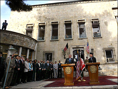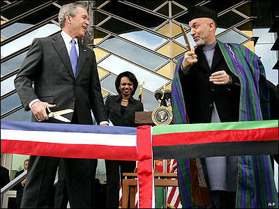 جورج بوش رييس جمهور آمريکا، روز چهارشنبه 1 مارس، به گونه غير منتظره ای وارد کابل پايتخت افغانستان شد. او از پيشرفت افغانستان در زمينه دموکراسی و آزادی مطبوعات تقدير کرد و به حامد کرزی همتای افغان خود گفت که افغانستان، کشورهای ديگر را به تحرک واداشته است. لارا بوش همسر رييس جمهور و کاندوليزا رايس وزير خارجه آمريکا، آقای بوش را در اين سفر همراهی می کردند.