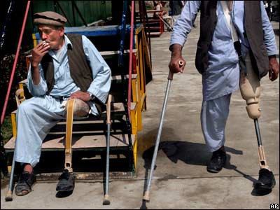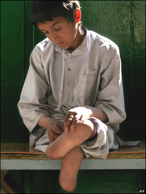 عبيدالله، نوجوان 12 ساله، معلول برخورد با مين در دوران طالبان است. او در يک مرکز صليب سرخ در کابل، منتظر دريافت پای مصنوعی است