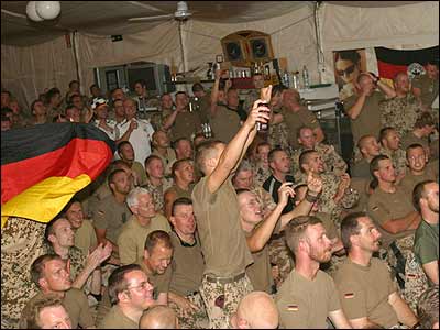 صدها سرباز آلمانی هزارها مايل دور از آلمان در افغانستان مسابقه روز جمعه (3 ژوئن) کشورشان با آرژانتين را به دقت دنبال کردند. سربازان و صاحب منصبان آلمانی در يک پايگاه کلان در هوای گرم سوزان مزار شريف و در زير يک چادر جمع شده بودند تا از پشت پرده تلويزيون تيم ملی کشورشان را در مقابل آرژانتين تشويق کنند. در شهر شمالی مزارشريف حدود دو هزار سرباز آلمانی مستقر هستند. در نيمه اول بازی که بازی به نفع آرژانين بود، ياس و نگرانی در چهره سربازان آلمانی ديده می شد، اما گل دقيقه 80 کلوزه همه چيز را تغيير داد و سربازان آلمانی در مزار شريف شروع به رقص کردند و ...