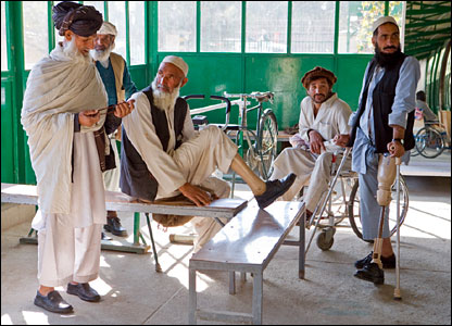 مردان افغان در يک مرکز ارتوپدی (جراحی استخوان) در کابل که توسط سازمان صليب سرخ بين المللی اداره می شود. این اداره تاکنون به حدود هشتاد هزار نفر در افغانستان کمک کرده است.