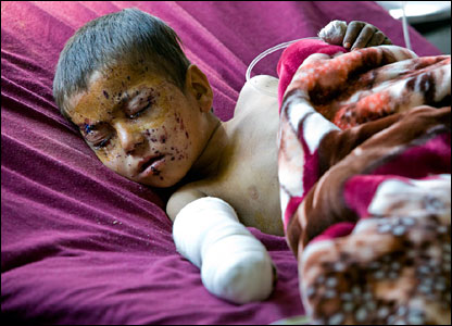 اين پسرک افغان شش سال دارد و در يکی از بیمارستان های قندهار تحت درمان است. او در حاليکه در نزديکی خانه اش مشغول بازی بود، در اثر انفجار يک مين زخمی شد. پزشکان می گويند بينايی او در اثر اين حادثه صدمه نديده است.