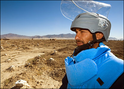در این عکس، يک کارمند اداره مين روبی در افغانستان دیده می شود. سنگ های سفيد علامت اراضی پاکسازی شده از مين در نزديکی فرودگاه بگرام در شمال کابل است. پاکسازی این زمین به مساحت دو کیلومتر مربع، حدود ده ماه طول کشید.