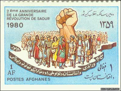 با روی کار آمدن حزب دموکراتيک خلق به رهبری نور محمد تره کی، تیکت های پستی (تمبر) نیز، به عرصه ای برای تبلیغات حزبی و سیاسی تبدیل شد. تصاویری از نورمحمد تره کی به عنوان "موسس حزب دموکراتیک خلق افغانستان"، کودتای هفت ثور، طرح و تصاویر کارگری و کمونیستی، به همراه چاپ تصاویر رهبران شوروری، از جمله لنین، طرحهای تیکت های پستی این دوره را تشکیل می داد. این تیکت ها، همچنین تغییراتی را که گفته می شد حاکمیت جدید افغانستان، در زندگی مردم این کشور، از جمله زنان، جوانان و کارگران، به وجود آورده، به نمایش می گذاشتند. گرامیداشت سالگرد کودتای هفت ثور، تا زمان سقوط دولت دکتر نجیب الله در ابتدای دهه نود میلادی، از موضوعات ثابت تمبرهای پستی افغانستان بود. متن این تیکت های پستی، به زبان های پشتو و فرانسوی بود.