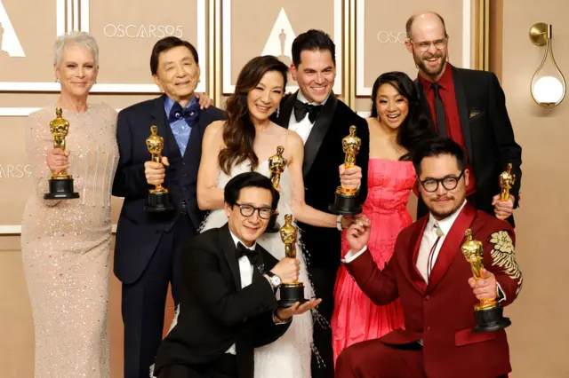 «همه جا، همه چیز، یک آن» علاوه بر اسکار بهترین فیلم، کارگردانی و فیلمنامه غیراقتباسی، جوایز رشتههای بهترین بازیگر نقش اول زن، نقش مکمل زن و مرد و بهترین تدوین را هم از آن خود کرد. آخرین باری که یک فیلم توانسته بود هفت جایزه اسکار بگیرد، ۹ سال پیش بود؛ در اسکار ۲۰۱۴ فیلم «جاذبه» ساخته آلفونسو کوارون مکزیکی چنین موفقیتی کسب کرد، هرچند که در آن دوره جایزه بهترین فیلم به «۱۲ سال بردگی» رسید.
