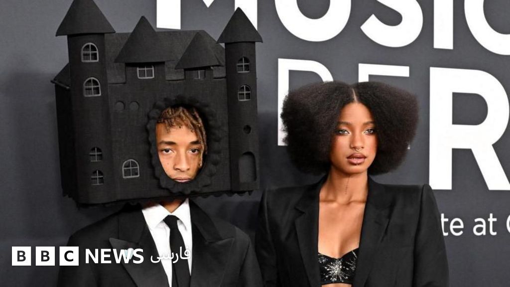 توضیح تصویر، جیدن و ویلو اسمیت، خواننده و بازیگر و فرزندان ویل اسمیت، نمادی از خانههای سوخته در آتشسوزی اخیر لسآنجلس را در مراسم گرمی به نمایش گذاشتند
