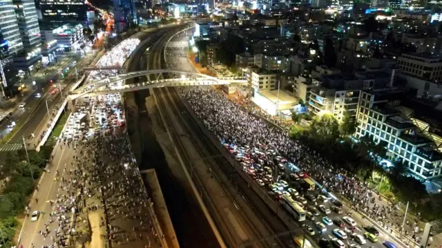 در تلآویو دهها هزار نفر بزرگراه آیالون را مسدود را کردند و پلیس برای جلوگیری از پیوستن جمعیت بیشتر به تظاهرکنندگان خیابانهای منتهی به آن را بسته است.