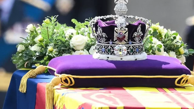 روی تابوت ملکه تاج سلطنتی قرار گرفته است که یکی از شاخصترین جواهرات سلطنتی به شمار میرود؛ مجموعهای گرانبها از دههاهزار سنگ قیمتی که میراث قرنهای پادشاهان و ملکههای بریتانیایی است.