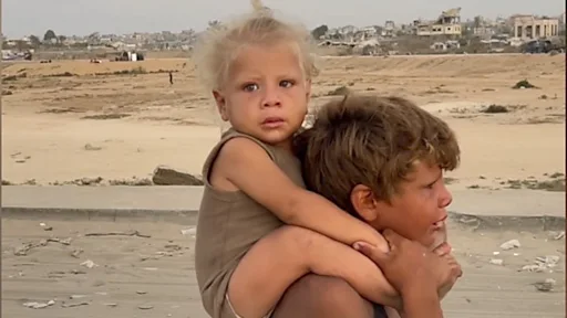 در میان آشوب و وحشت ناشی از آوارگیهای اجباری در غزه، پسر بچهای کوچک و پابرهنه با اضطراب میگریزد و برادر کوچکش را در آغوش دارد. در حالی که صدایش از گریه گرفته، بارها و بارها فریاد میزند: «یا امی»؛ یعنی «مامان».