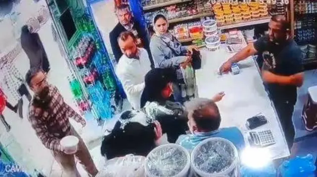 در این هنگام فردی که پشت دخل مغازه ایستاده و یکی از مشتریان مرد به طرف مرد مهاجم میروند و او را از مغازه بیرون میاندازند.