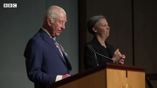 چارلز سوم، پادشاه بریتانیا، روز دوشنبه در پارلمان استرالیا سخنرانی کرد. او کت و شلواری با پیراهن سفید و کراوات آبی و سفید به تن داشت، چند مدال روی یقه چپش نصب شده بود و یک گردنبند طلا به گردن داشت. نگاه او کمی با دوربین زاویه داشت، و یک نفر از حضار در جلو تصویر دوربین و پرچم استرالیا در پسزمینه دیده میشد.