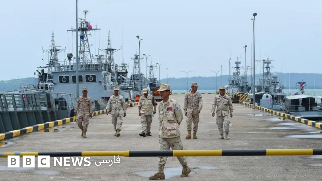 توضیح تصویر، نیروهای دریایی کامبوج در اسکله پایگاه «ریم» که در خلیج تایلند واقع شده، گشت می‌زنند