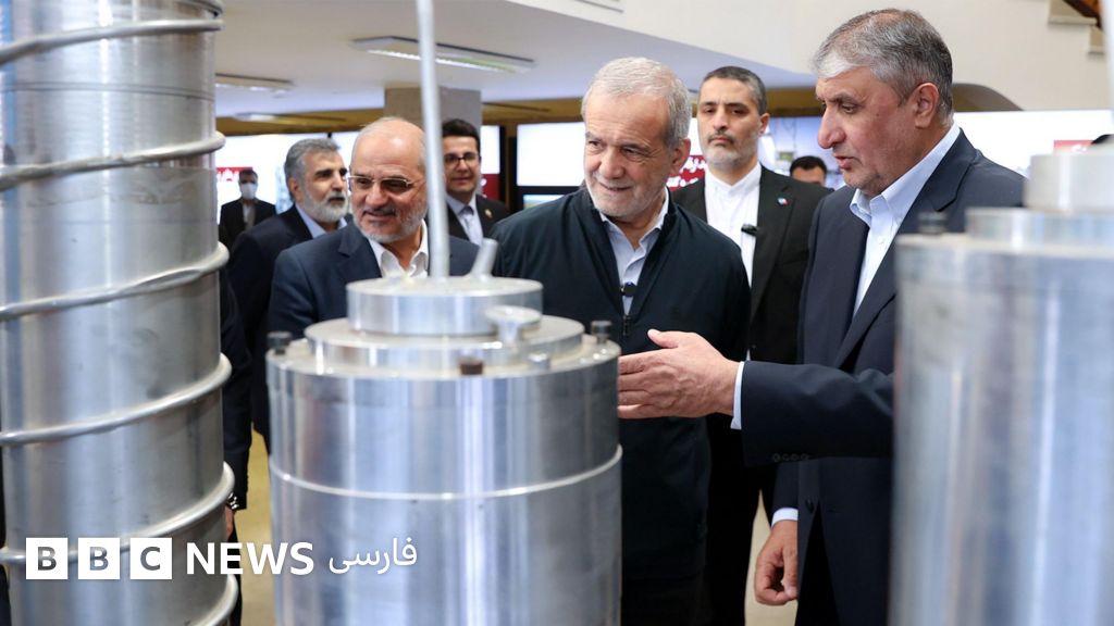 توضیح تصویر، مسعود پزشکیان رئیس جمهور ایران در کنار محمد اسلامی، رئیس سازمان انرژی اتمی ایران (نفر اول از سمت راست) در بازدید از نمایشگاه «دستاوردهای هسته‌ای» در فروردین امسال