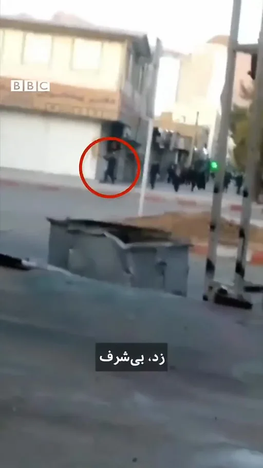 در ویدیوی که از بلوار طاقبستان کرمانشاه به دست بیبیسی رسیده بود، یک مامور نیروهای انتظامی را نشان میداد که کنار دیوار کمین کرده بود و با سلاحی شبیه به کلاشنیکف به سمت یک شهروند معترض در وسط خیابان تیراندازی میکذد و پس از اصابت گلوله این شهروند به زمین میافتد.