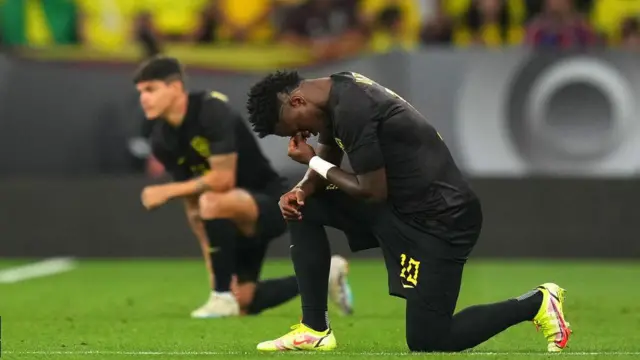 تیم ملی فوتبال برزیل در نیمه اول دیدار مقابل گینه که در اسپانیا برگزار شد، در راستای کارزار مبارزه با نژادپرستیاش با لباس سراسر سیاه در زمین حاضر شد.