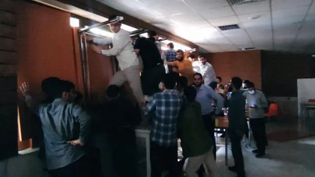 نیروهای حراست ابتدا با همراهی بسیجیها مانع از ورود معترضان شدند. معترضان تلاش کردند با شکستن شیشهها وارد شوند اما بسیجیها با میز و صندلیهای سالن مانع ورود آنها شدند. با وجود این معترضان در نهایت توانستند وارد سلف شوند.