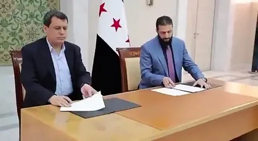 براساس گزارشها امروز جلسهای در دمشق میان احمد شرع، رئیس جمهور موقت سوریه و مظلوم عبدی، فرمانده نیروهای دموکراتیک سوریه به رهبری کردها که کنترل شمال شرق سوریه را دردست دارند برگزار شد و توافقنامهای بین دو طرف به امضا رسید.