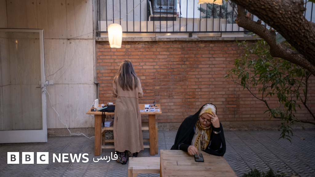 تصویر زنی میانسال با چادر مشکی در یک کافه مشغول نگاه کردن به گوشی موبایلش. در پشت او دختری بدون حجاب ایستاده است.