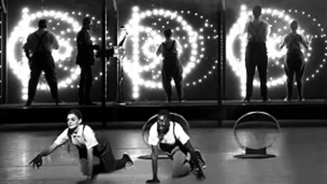 در عین حال دو آسانسور شیشه ای که یک مرد و یک کودک در آن قرار دارند، به شکل های افقی و عمودی در حال حرکت بر روی صحنه اند و فضای بصری قوی ای ایجاد می کنند که در عین حال گیر افتادگی و چرخه زندگی بشر- از کودک تا بزرگسال- را یادآور می شود.