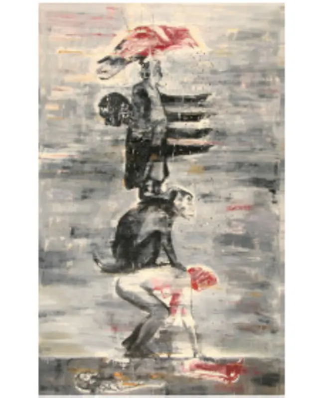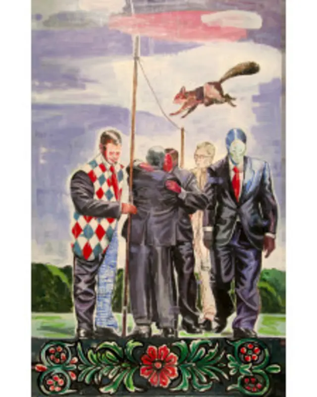 بله. این عنصر حیوان در جای جای کارها دیده می شود یا مثلا در تابلوی "پرش بزرگ" موشی را در بالای سر شخصیت ها گذاشته ام. در برخی جاها سعی کردم فضا را از سنگینی درآورم و شوخی کنم. فضای نقد قدرت در کار به حد کافی سنگین است. به این دلیل این عناصر را که به شکل حیوان است می بینید. در بسیاری از مواقع شوخی من تبدیل به یک طنز تلخ شده. علاوه بر آن در بسیاری از تصاویر لباس های چهارخانه رنگین وجود دارد که خواستم عنصر طنز و تمسخر را درمیان فضای سنگین کار بیاورم.