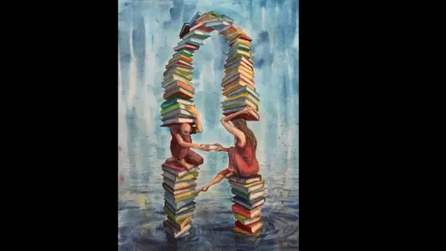 توضیح تصویر، این نمایشگاه شامل دو گروه از آثار درویش است، مجموعه Vision Bound Unbound طراحی و نقاشی هایی با موضوع کتاب و مجموعه کاغذ و حافظه.