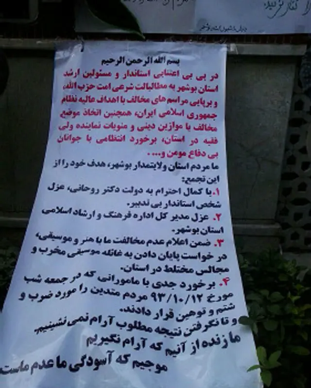 به گزارش خبرگزاری کار ایران (ایلنا) این گروه که حدود ۲۰۰ نفر بودند، بعد از ظهر روز دوشنبه، ۱۵ دی، با در دست داشتن پلاکاردهای اعتراض آمیز خواهان برکناری استاندار، مدیرکل ارشاد استان بوشهر و استیضاح وزیر فرهنگ و ارشاد اسلامی شدند.