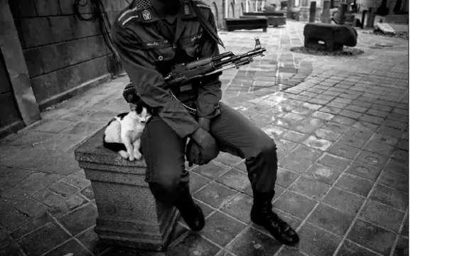 "سرباز و گربه"، تصویربچه گربه ای که روی زانوی سربازی مسلح خوابیده، اثر جلال شمساذران، عکاس زاده تبریز، یکی دیگر ازعکس های مورد توجه نمایشگاه است. عکاسی که معتقد است بین همه عوامل حیات درعالم هستی یک رابطه متافوریک و شاعرانه عمیق وجود دارد.