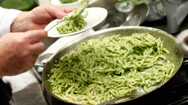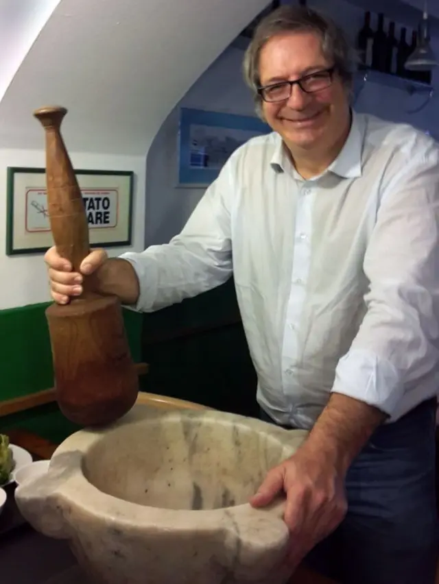 ما در رستوران پانیتزا در شهر جنوا هستیم که هر روز بین یک تا سه کیلو پستو مصرف می کند. یکشنبه روز تعطیل اوست ولی با اشتیاق تمام نحوه تهیه پستو با دست را به ما نشان می دهد.
