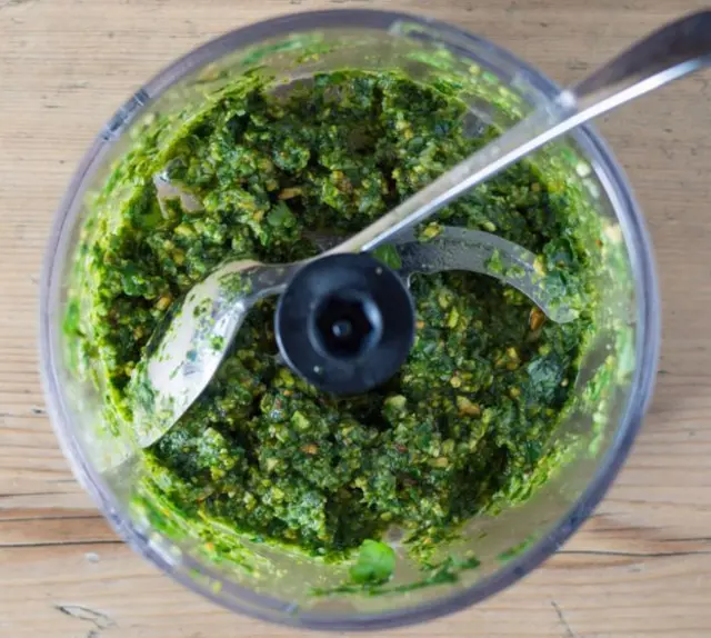 او چند حبه سیر، یک مشت تخم کاج، دانههای درشت نمک، مقداری روغن زیتون را داخل هاون می ریزد. وقتی می پرسیم چرا هیچیک از مواد را به دقت اندازه گیری نکردی، در پاسخ می گوید: "هر بار که درست می کنم متفاوت است ولی همیشه عالی است."
