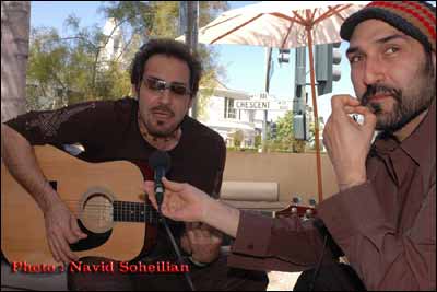 آهنگ "خواب موندی" کار خودته؟ آره. شعرش هم کار خانم پويا هست که کارهای منو دوست داره و لطف کرده اين رو به من داده. آهنگ "عاشق نشی" چی؟ اين رو نوشته بودم اما جزو آلبوم جديد نيست. البته يه آهنگ ديگه درست کردم به اسم "ديار" که خيلی به دلم چسبيده و اگر سوال می کردی "آيا آهنگ هات رو دوست داری" و من هم جواب کليشه ای می دادم که "همه آهنگ هام مثل بچه های من هستند"، اين آهنگ، يعنی "ديار" اون بچه خوبست! اونجا که بوديم نويد سهيليان هم داشت از سعيد عکس می گرفت و يکهو شروع کرد به قرقر کردن که وقتی ميکروفون رو روشن می کنی دوربين من لرزش پيدا می کنه! من هم برای اينکه زود موضوع رو عوض کنم از نويد خواستم که از سعيد يه سوال بپرسه...!
