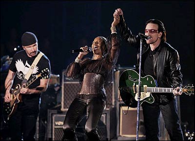 گروه موسيقی راک بريتانيايی 'U2' با بدست آوردن بيشترين جوايز 'گرمی'، برنده اصلی مراسم اعطای اين جوايز بود که در لس آنجلس برگزار شد. يو تو در اين مراسم آهنگی مشترکی با مری جی بلايج، (وسط) خواننده سبک آر اند بی اجرا کرد.