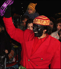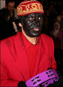 ظاهرا اين سياهی بايد نماد سرما و سياهی زمستان باشد اما مهرداد بهار می گويد « حاجی فيروز بازمانده آيين بازگشت ايزد شهيد شونده يا سياوش است. چهره سياه او نماد بازگشت او از جهان مردگان است و لباس سرخ او نيز نماد خون سرخ سياوش و حيات مجدد ايزد شهيد شونده، و شادی او شادی زايش دوباره آنهاست که رويش و برکت با خود می آورند ». ( ۲ ) علی بلوک باشی در « نوروز، جشن نوزايی آفرينش » نخست از آتش افروزها سخن به ميان می آورد که در ايام نوروز با آتش بازی ( مشعلی در دست داشتند و در آن می دميدند ) و خواندن شعر و تصنيف و رقص و پايکوبی و شيرينکاری مردم را می خنداندند و سرگرم می کردند. مردم نيز به آنها انعام می دادند. سپس حاجی فيروز را جانشين آنها می داند و می نويسد « در اين زمان آتش افروزها جای خود را به حاجی فيروزها داده اند. حاجی فيروزها هم مانند آتش افروزها لباس سرخ يا رنگارنگ با زنگ و منگوله می پوشند و صورت و گردن را سياه می کنند، ولی بدون آتش و مشعل به خيابان می آيند و با ساز و آواز و زدن دف و دايره و رقص و شيرينکاری به استقبال نوروز می روند».