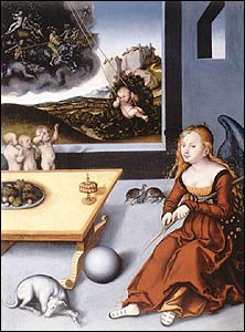 تابلوی نقاشی "ماليخوليا" اثر لوکاس کراناخ که در سال 1532 خلق شده و ارتباط بين ماليخوليا و دانش را بيان می کند.