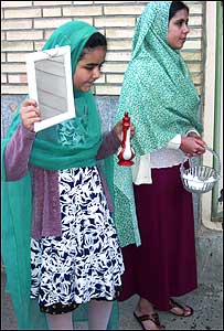 در مراسم "مواکا کوگوای" شیرازی های زنگبار که برخی آنرا "نیروزی" می نامند نیز آتش روشن می شود و زن و مرد به گرد آن می چرخند. وجود آتش یکی از دلایلی است که شیرازی ها، این مراسم را که با نوروز ایران تفاوت بسیار دارد به آن نسبت می دهند. تفآل در نوروز تفآل در نوروز یا باور به شگون در آداب نوروزی در بسیاری از کشورها وجود داشته و دارد." قاشق زنی" و "فال گوش" در ایران، "گولاخ فالی" و" پاپاق آتماق" (کلاه گردانی) در آذربایجان، "بخت گشایان" در تاجیکستان و ازبکستان، "شال اندازی" در کردستان و "سبد اندازی" در پامیر و همچنین "نخ بندی" و "کجاوه اندازی" از جمله مراسمی است که براساس آن وضعیت زندگی و محصول، ازدواج و بخت جوانان همچنین سلامتی خانواده و شخص در سال نو پیش بینی وتفآل زده می شود. در سفره نوروزی ایران گاهی دیوان حافظ به منظور تفآل قرار داده می شود. تحویل سال تحویل سال نو ایرانی که از صدها سال پیش با محاسبات دقیق نجومی محاسبه می شود بیانگر لحظه ای خاص است که با مراسم آیینی همراه می شود. افغانستان تنها کشوری است که همراه با ایران سال نو را آغاز می کند، ولی آغاز سال نو برای آنها با افراشتن بیرق منسوب به امام علی "ژنده سخی" رسمیت می یابد. در کشورهای آسیای میانه و قفقاز گاهی نوروز را با آغاز سال نو ارتباط می دهند. اما بنظر می رسد با پذیرش سال نو و تقویم میلادی، نوروز در این کشورها بیشتر آغاز بهار را تداعی کند تا شروع سال نو را. خوان نوروزی مراسم نوروز در بیشتر کشورها با گستردن سفره ای همراه است که معروفترین آن "سفره هفت سین" است. در نوشته های نوروزی و روایات شفاهی از انواع دیگر سفره همچون "هفت شین"، "هفت میم"، "هفت چین" نیز سخن گفته شده است.