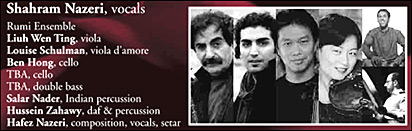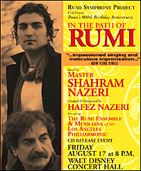 ارکستر فیلارمونیک لس آنجلس میزبان صدای شهرام ناظری و پنجه های حافظ ناظری خواهد بود. این کنسرت به دنباله سری کنسرتهای ناظری در معرفی راه مولانا به جهانیان است. برای بسیاری روشن است که سه دهه تلاشهای شهرام ناظری در راه معرفی نگاه و جهان بینی مولانا در موسیقی اصیل ایرانی بود که باعث شد تب مولانا جهانگیر شود.