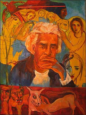 بخش زیادی از تابلوها پرتره اند و در میان پرتره ها تصویر شاملو و فروغ چشمگیرتر است. هانیبال در باره پرتره گفته است: مردم از آویزان کردن نقاشی چهره ترس روانی دارند. باید این ترس را از بین برد. ما باید به فرهنگ دیواری خود که سطح بسیار نازلی دارد بیندیشیم.