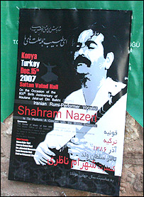 پوستر تبلیغاتی کنسرت شهرام ناظری روی دیوار آرامگاه مولانا خودنمایی می کرد اما تنها کنسرتی که در قالب برنامه های مراسم هفده روزه گرامیداشت مولانا در برنامه رسمی اعلام شده بود به حسام الدین سراج، یکی دیگر از خواننده های مشهور موسیقی عرفانی ایران تعلق داشت که آن هم برای روز سوم مراسم یعنی حدود دو هفته پیش برنامه ریزی شده بود. یکی از مسئولان مراسم می گفت که کنسرت شهرام ناظری تنها چند روز قبل و به صورت از پیش اعلام نشده به برنامه مراسم اضافه شده بود. کنسرتهای موسیقی اغلب در یکی از تالارهای شهر قونیه برگزار می شد و شهرام ناظری تنها هنرمند خارجی بود که کنسرتش در تالار موسیقی محل اصلی مراسم، یعنی مرکز فرهنگی مولانا برگزار شد. تالار گنجایش هفتصد نفر را داشت اما تقریباً هزار نفر تماشاچی خودشان را به هر نحو شده در تالار جا داده بودند و البته اکثریت قاطعشان هم ایرانی بودند که این خودش نشانه ای بود از رقم چشمگیر و بی سابقه مسافران ایرانی در شهر قونیه.