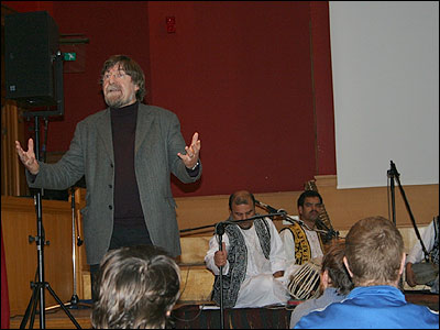 پیش از آغاز کنسرت، پرفسور نایجل آزبورن، استاد دانشگاه ادینبورگ، در مورد موسیقی افغانی برای حاضران سخنرانی کرد